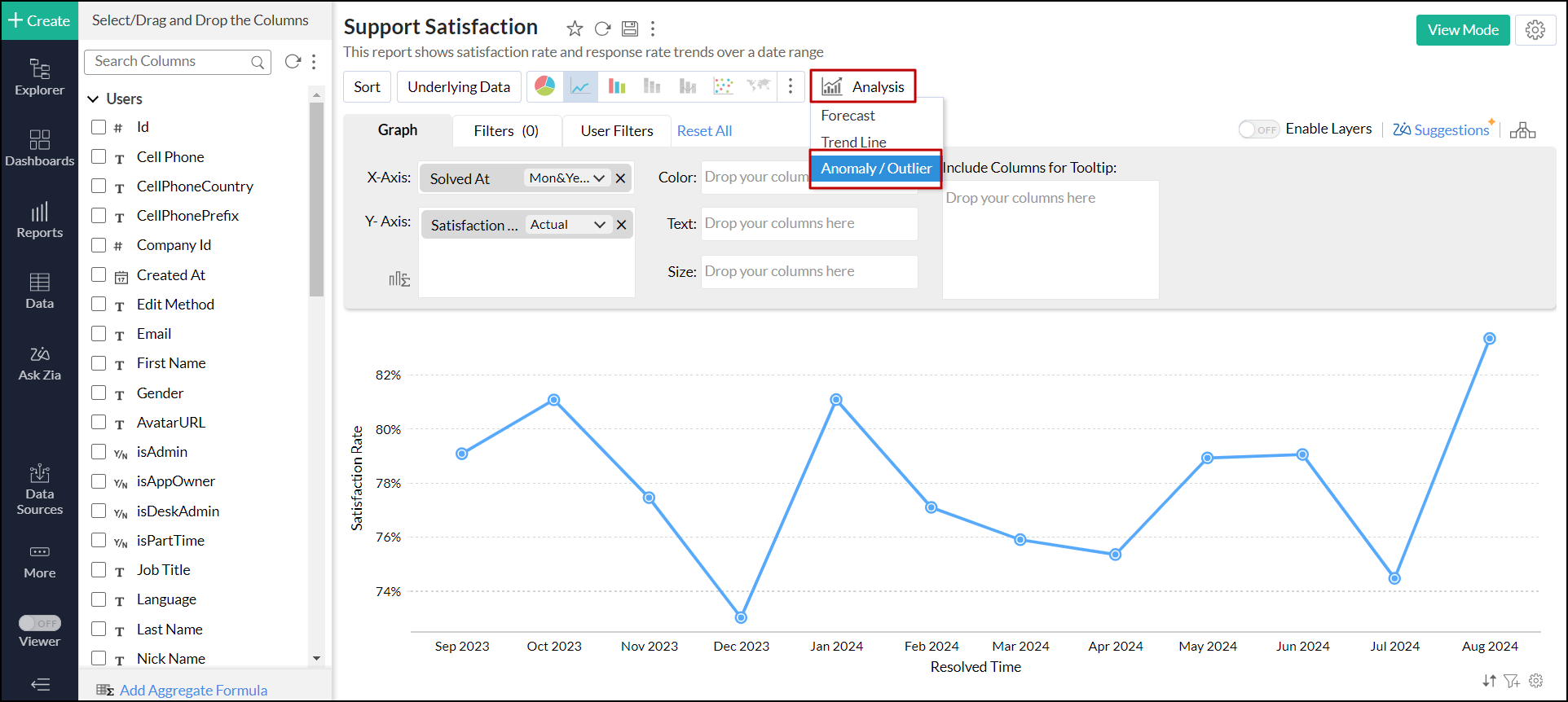- Anomaly or outlier detection is supported for all types of line and bar charts.