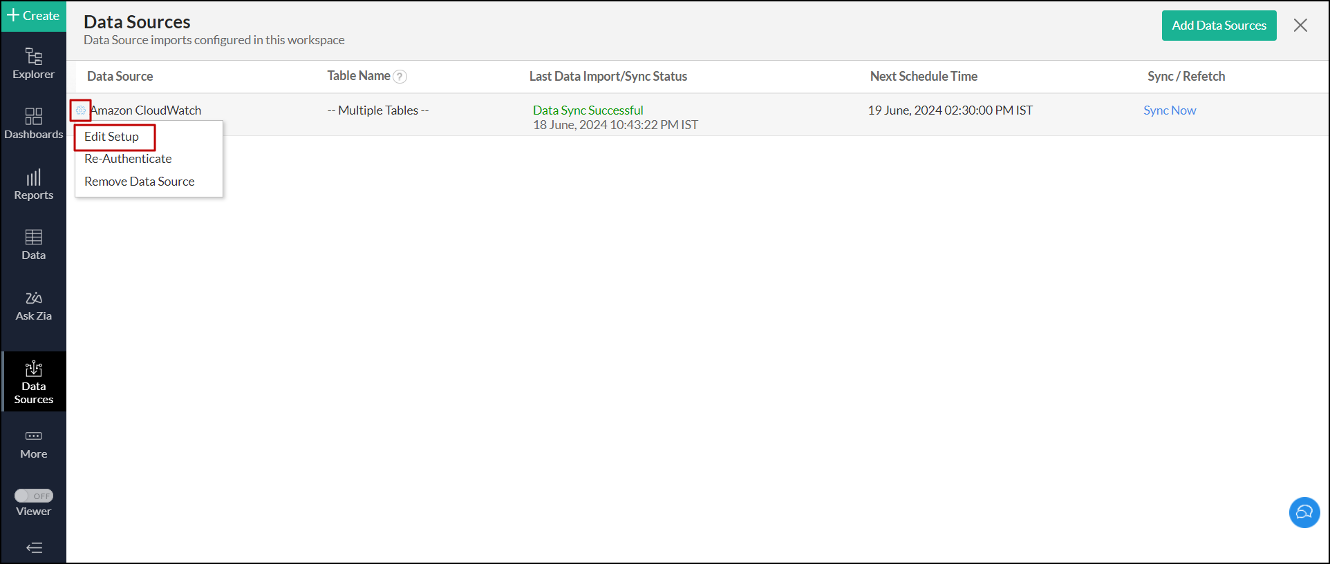 - Click the Settings icon that appears on mouse over the Amazon CloudWatch data source and click the Edit Setup option.