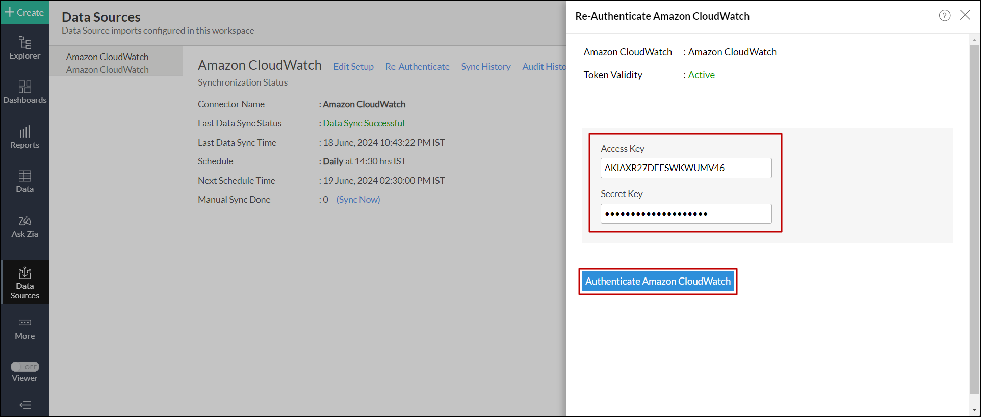 - Provide the Access Key and Secret Key, and and click Authenticate Amazon CloudWatch.