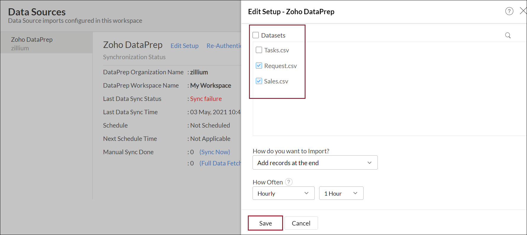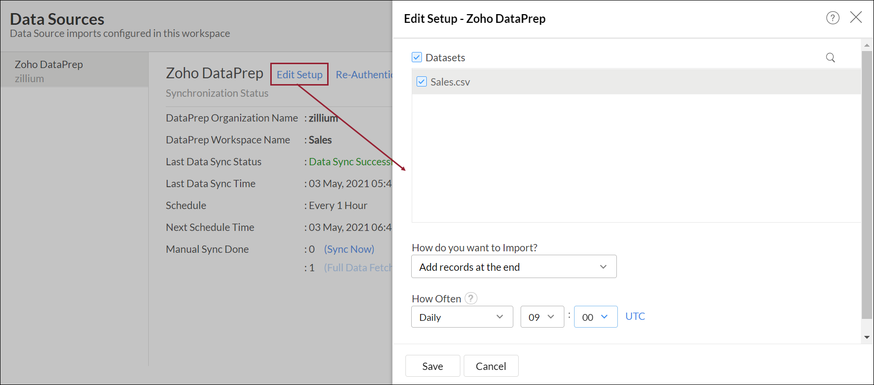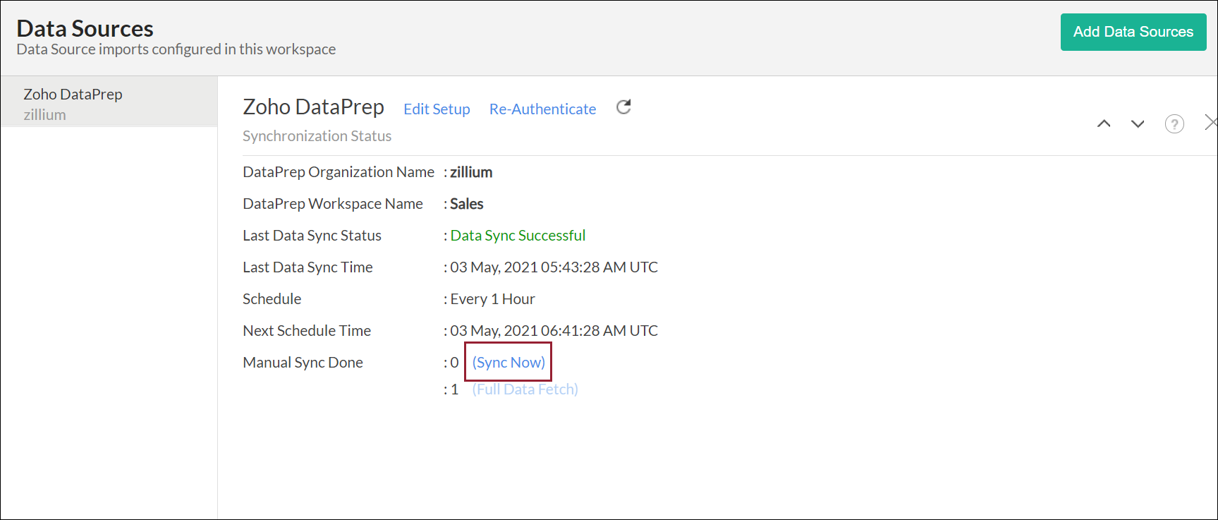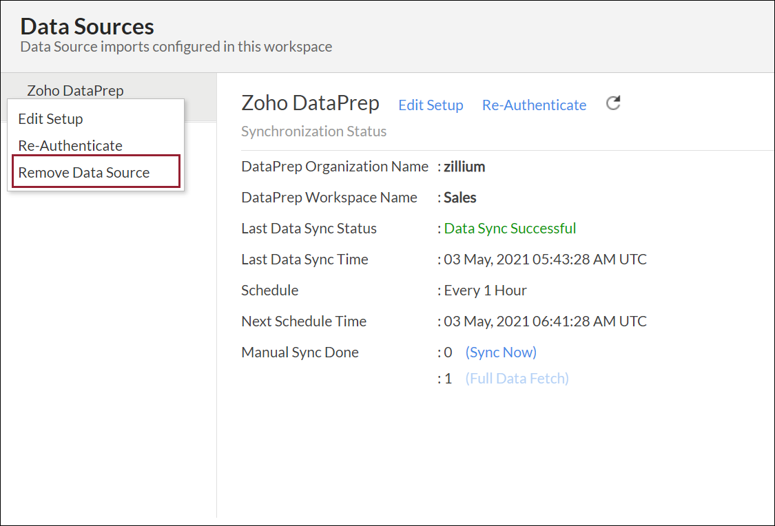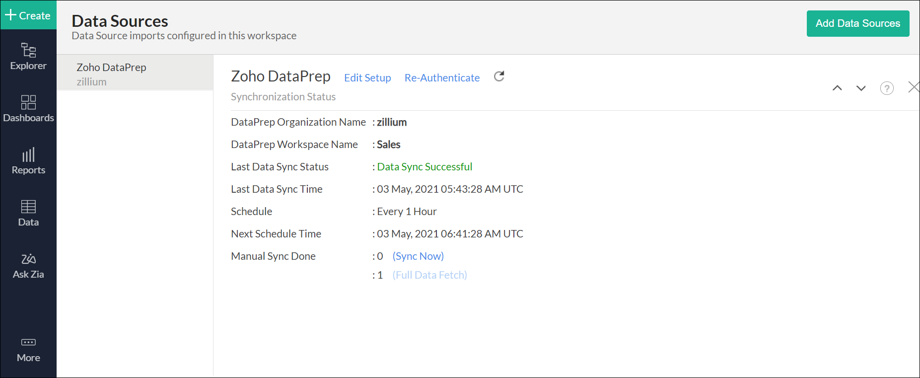 To edit the connection and synchronization settings, select Data Sources -> ​Zoho DataPrep from the side panel.