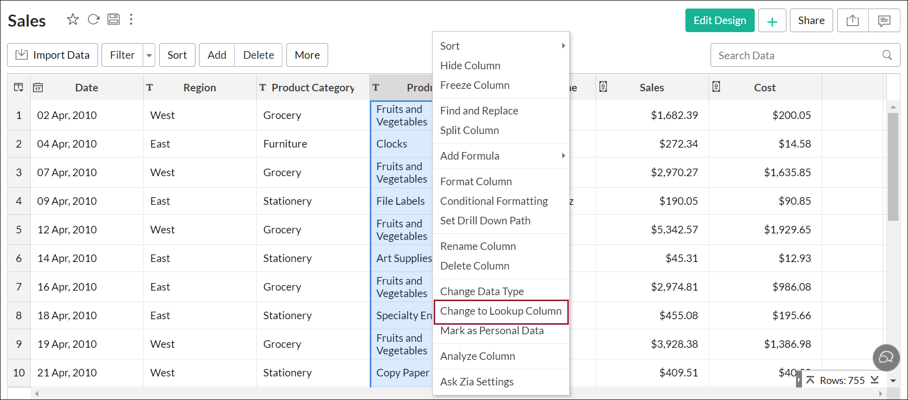 • Open the corresponding table, right click the column header and select the Change to Lookup Column option.