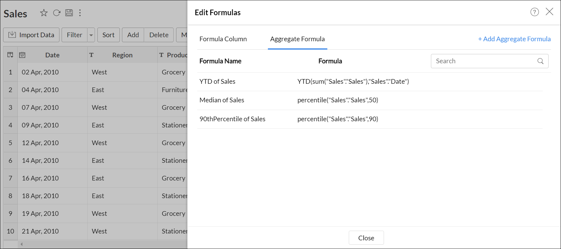 Formulas are calculations that can be defined using the powerful formula engine in Analytics Plus, to create required reports. Refer this documentation to know more. There are also several default formulas created based on the Zoho DataPrep modules. To view the default formulas, open the required table, click Add and select the Edit Formulas option.
