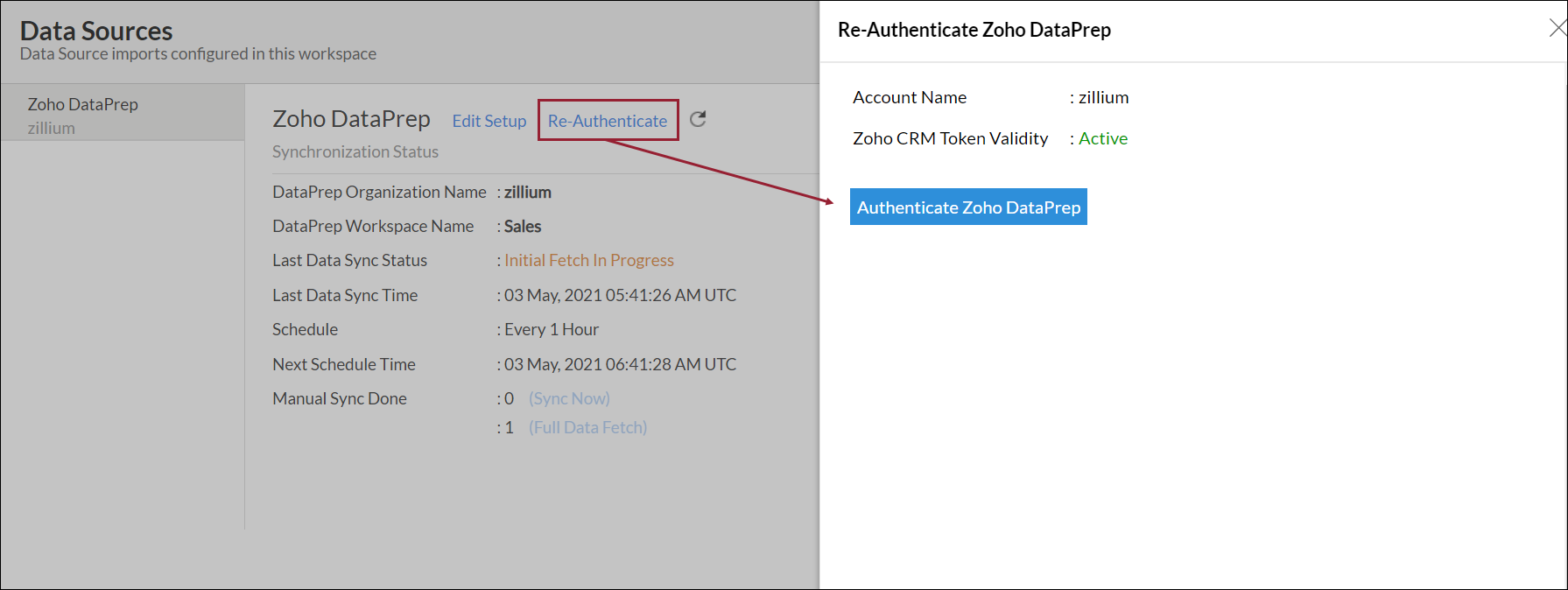 The import or synchronization process of your Zoho DataPrep data can fail sometimes, due to a variety of reasons. To resolve this, click the Data Sources option from the side panel and click the Re-Authenticate link. In the popup that appears, click Authenticate Zoho DataPrep​. Enter the Zoho DataPrep App Name and Secret Token and click the Authenticate Zoho DataPrep button.