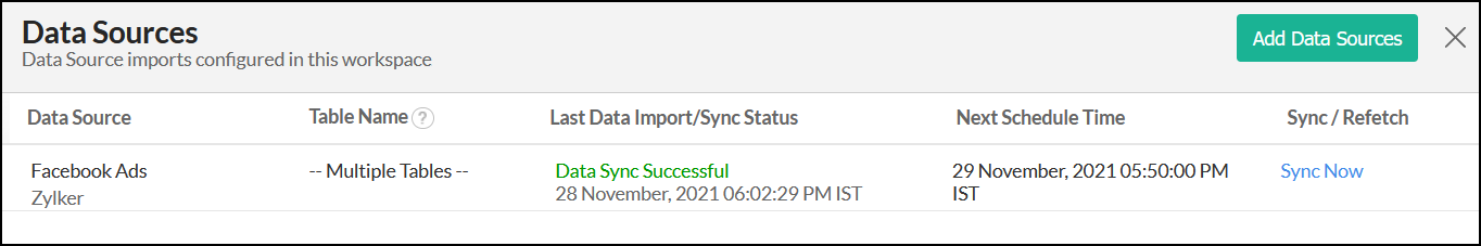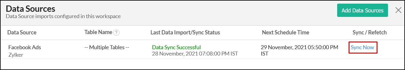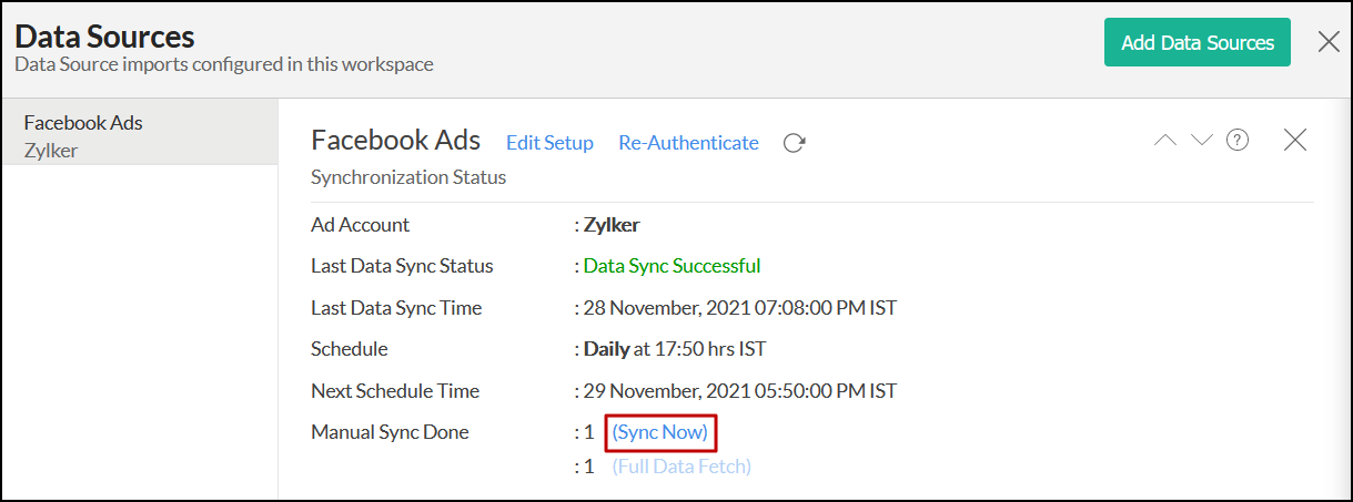 You can also access the Facebook Ads data source page, and click Sync Now.