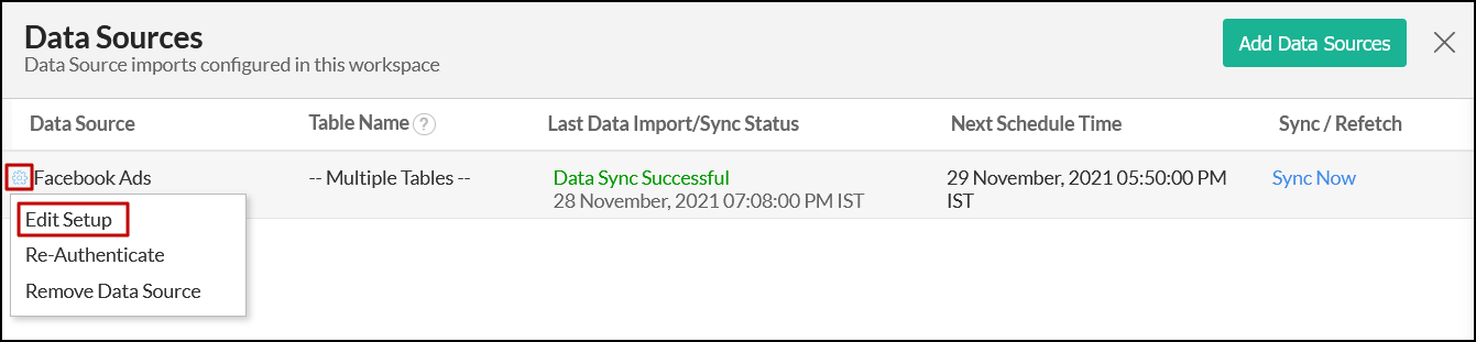 1. Click the Settings icon that appears on mouse over on the Facebook Ads data source and click the Edit Setup option.