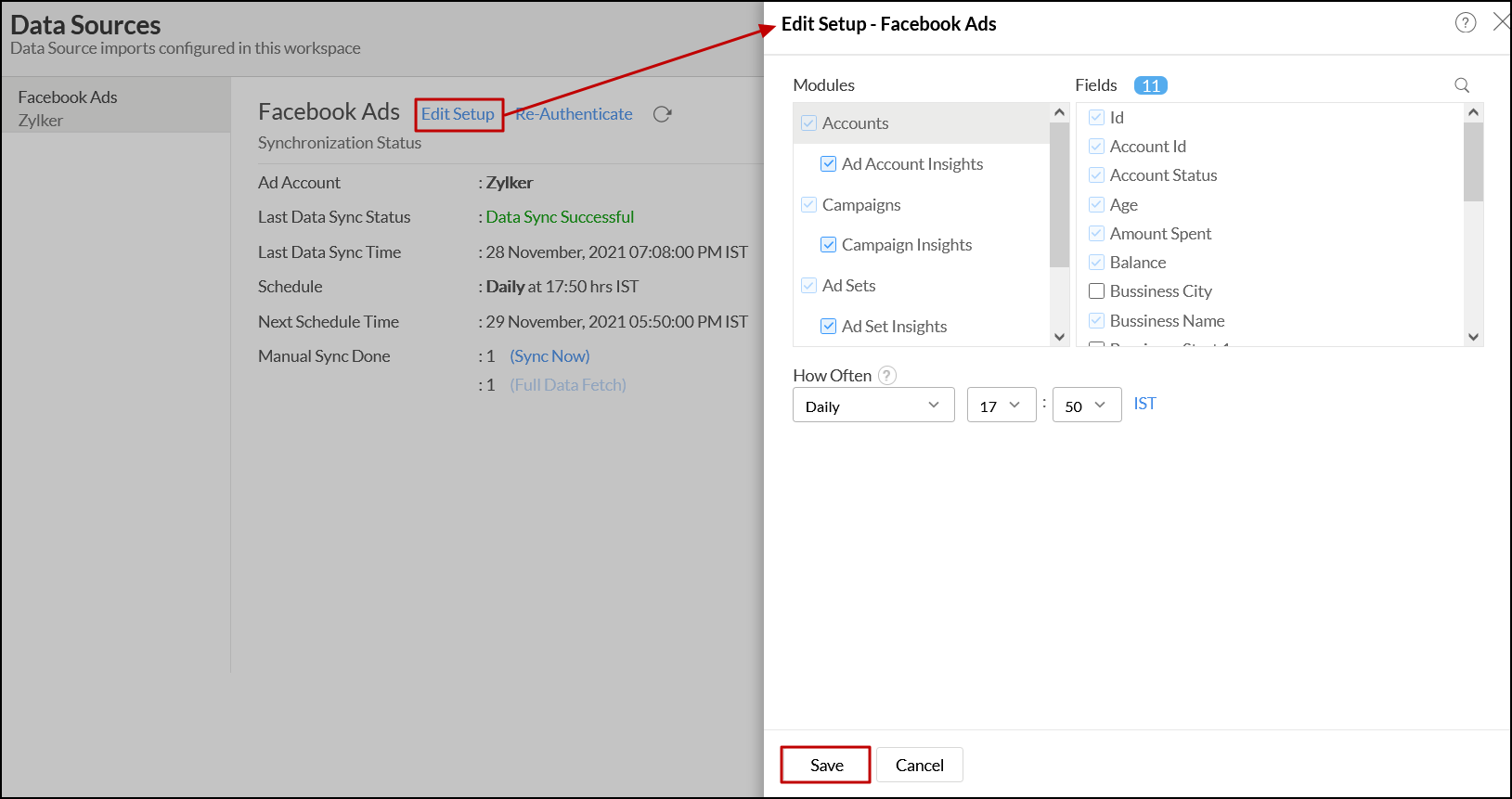 2. Navigate to the Facebook Ads data source, and click the Edit Setup link.