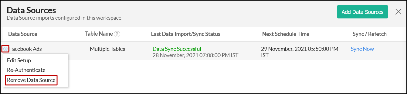 • Click the Settings icon that appears on mouse over the data source's name, and select Remove Data Source.