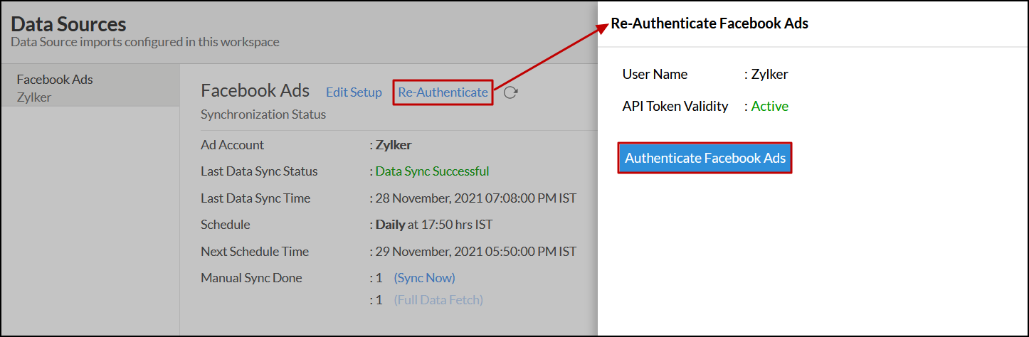 2. Navigate to the Facebook Ads data source, and click the Re-Authenticate link.