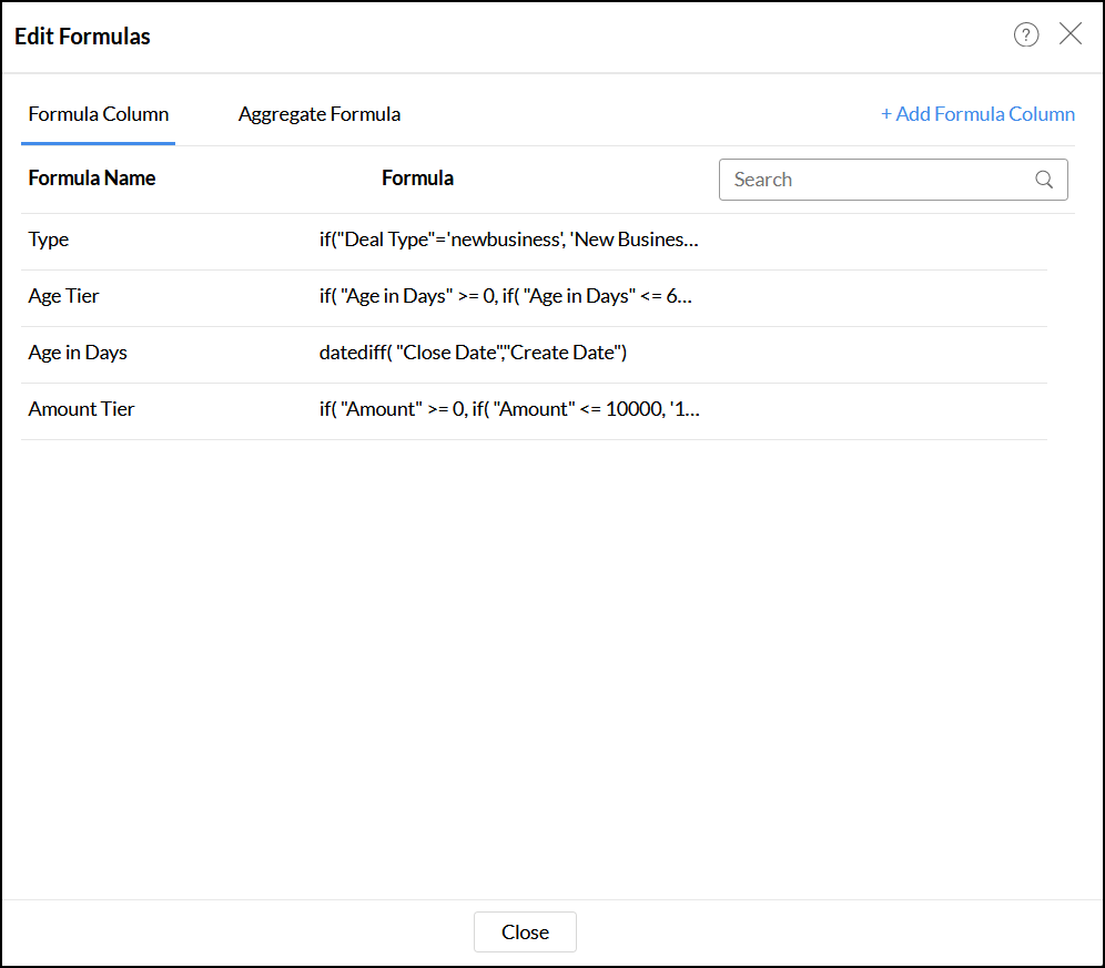 Formulas are calculations that can be defined using the powerful formula engine to create required reports. Refer this documentation to know more. There are also several default formulas created based on the HubSpot CRM modules. To view the default formulas, open the required table, click Add and select the Edit Formulas option.