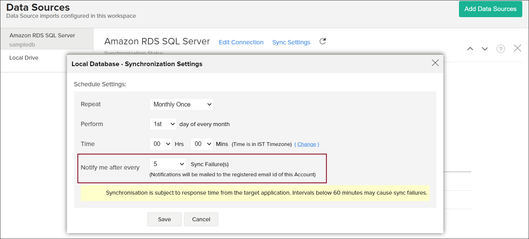 Specify the number of consecutive import failure after which you are to be notified using the Notify me after every 'N' Sync Failure (s) section.