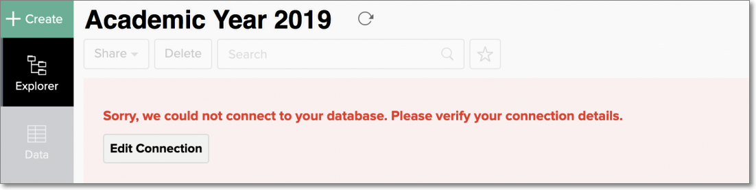 If the database is renamed or deleted, Analytics Plus loses the connectivity to cloud database, and the following error message appears.