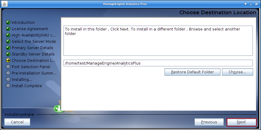 Choose the installation directory where ManageEngine Analytics Plus is to be installed. By default, the application is installed in the home/<user>/ManageEngine/AnalyticsPlus directory. Use the Choose section to change the default directory, and click Next to proceed.