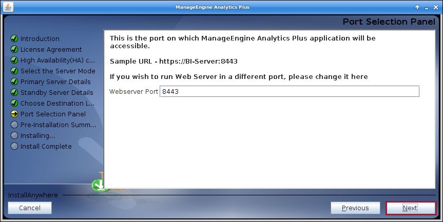 Enter the web server port number. The default port number provided is 8443. You can specify an alternate port number if 8443 is being used by a different application. Click Next to proceed.