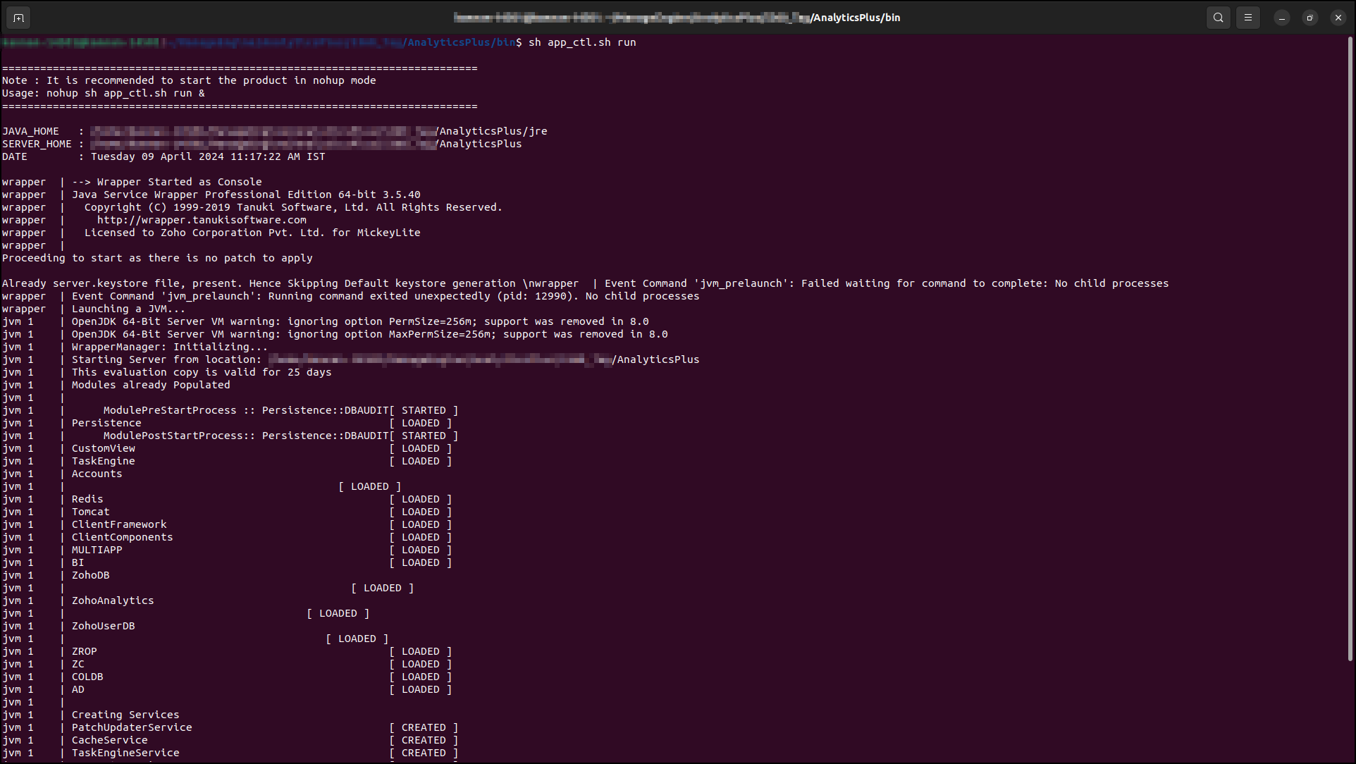 Navigate to the <Analytics Plus Home>/bin folder and run app_ctl.sh run command to start the application. For headless mode, run the nohup sh app_ctl.sh run command.