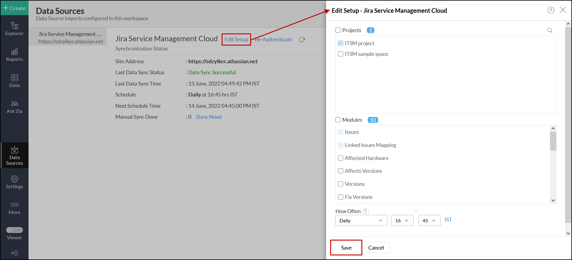 Click the Settings icon that appears on mouse over on the Jira Service Management Cloud data source and click the Edit Setup option.