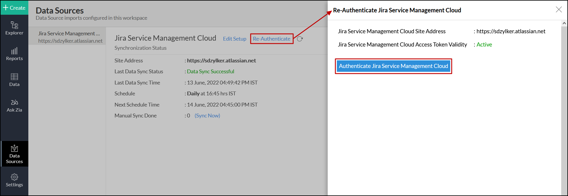 Navigate to the Jira Service Management Cloud data source, and click the Re-Authenticate link.