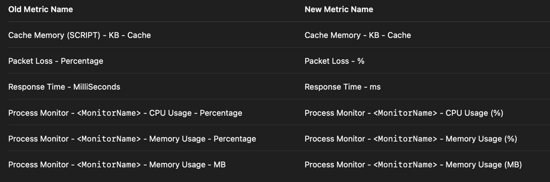 Example: A process monitor by the name "Process Monitor - VGAuthService - CPU Usage - Percentage" will be renamed as "Process Monitor - VGAuthService - CPU Usage (%)"