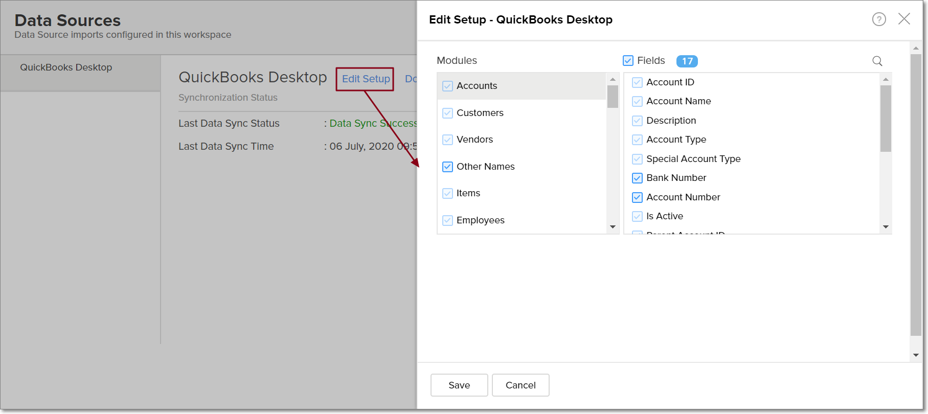 To edit the modules and fields imported from QuickBooks Desktop, open your Analytics Plus application, and select Data Sources -> QuickBooks Desktop from the side panel.