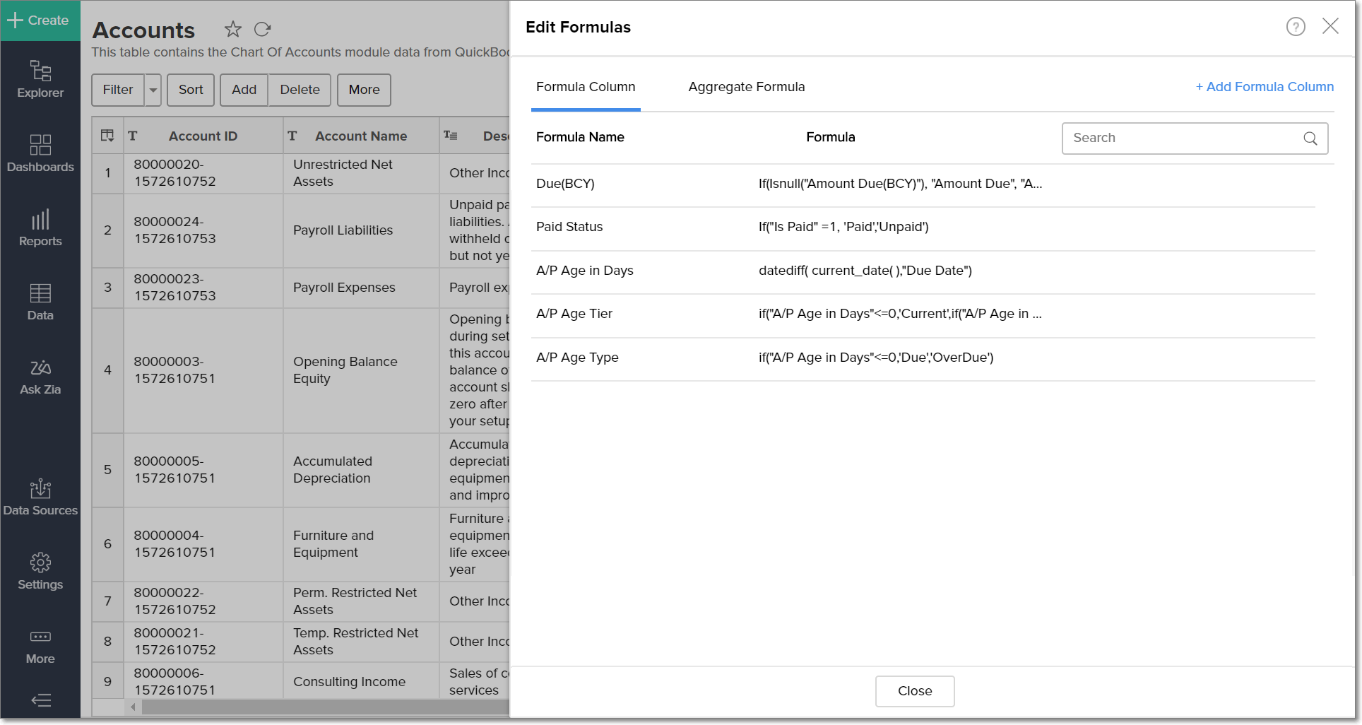Formulas are calculations that can be defined using the powerful formula engine in Analytics Plus, to create required reports. Refer this documentation to know more. There are also several default formulas created based on the QuickBooks Desktop modules. To view the default formulas, open the required table, click Add and select the Edit Formulas option.