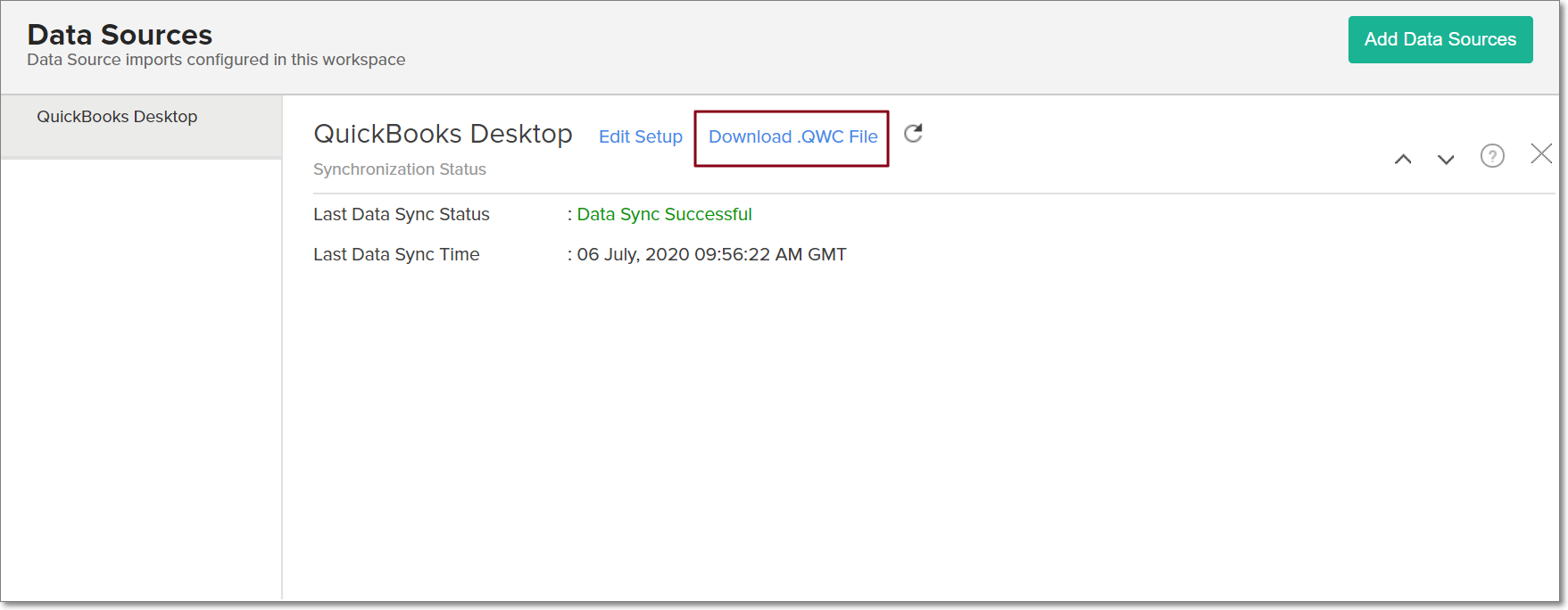 You can download the latest .QWC file even after the setup is completed. To do this, click the Data Sources button from the left-side panel. In the page that appears, click Download .QWC File