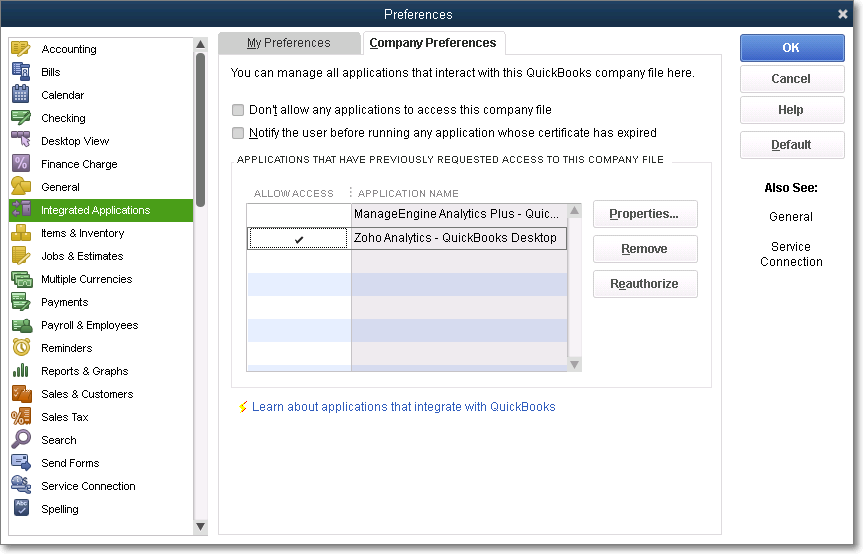 • In the QuickBooks Desktop application, click Edit -> Preferences. Navigate to the Integrated Applications section, select the Analytics Plus application, and click Remove