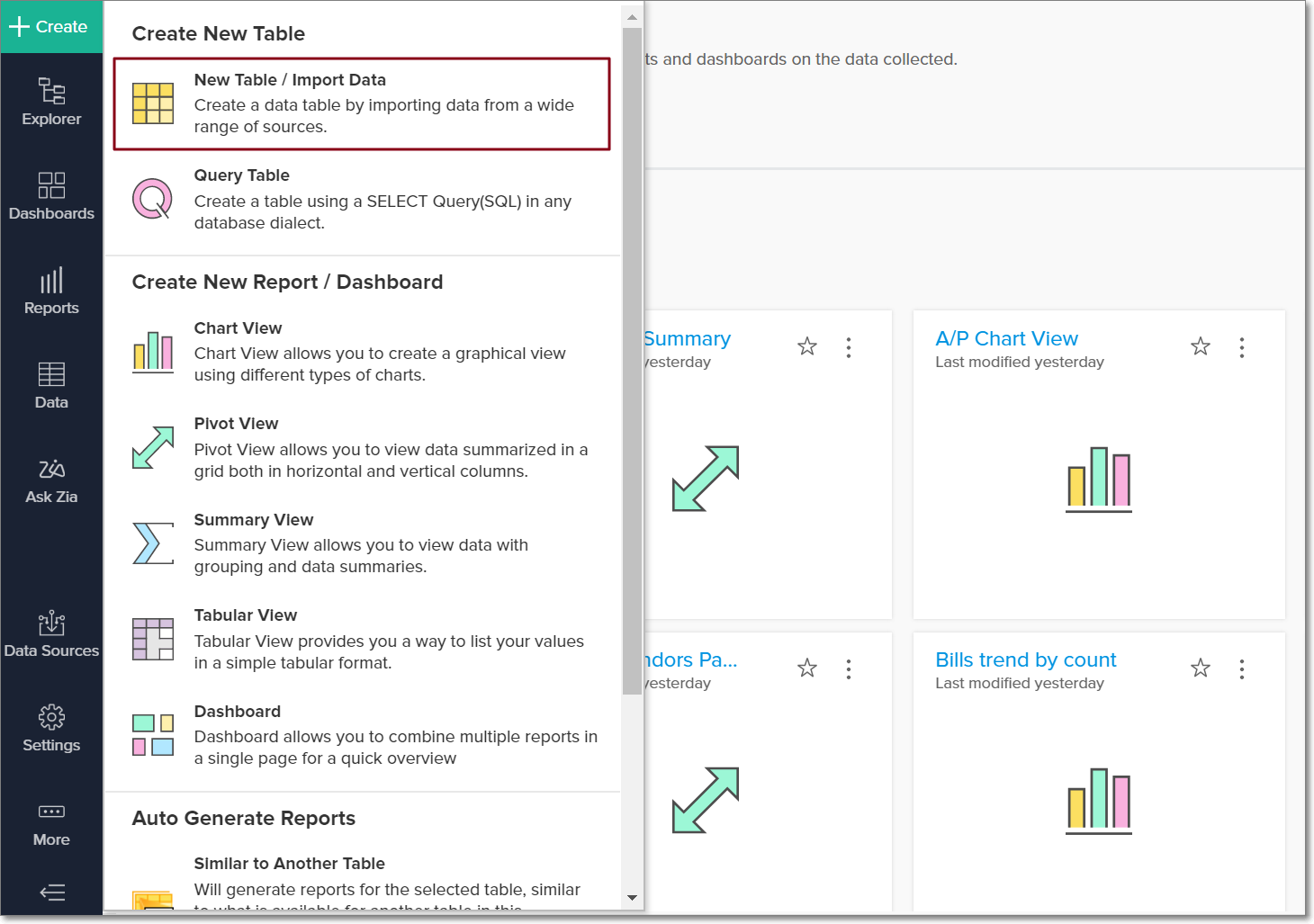 To do this, open the QuickBooks Desktop workspace, click Create from the side panel and select the New Table / Import Data option. You can integrate with other applications, or choose to import data stored in local filesweb URLslocal databasescloud databases and cloud drives. Click the corresponding links to know more.