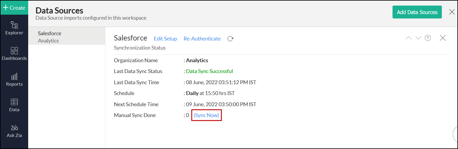 Yes. To do this, click the Data Sources option from the side panel. In the page that appears, navigate to the Salesforce source and click the corresponding Sync Now button.