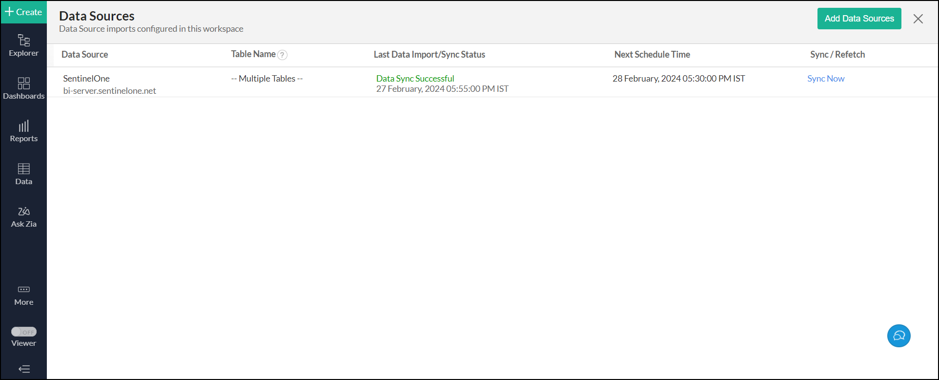 The data from SentinelOne is synchronized with Analytics Plus automatically, and stored in the form of various tables. Therefore, it is not possible to add data or modify the existing data present in these tables.