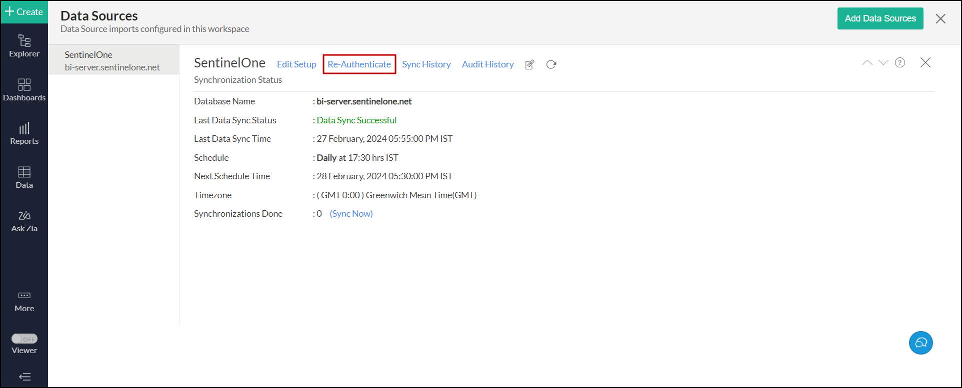 - Navigate to the SentinelOne data source, and click the Re-Authenticate link.