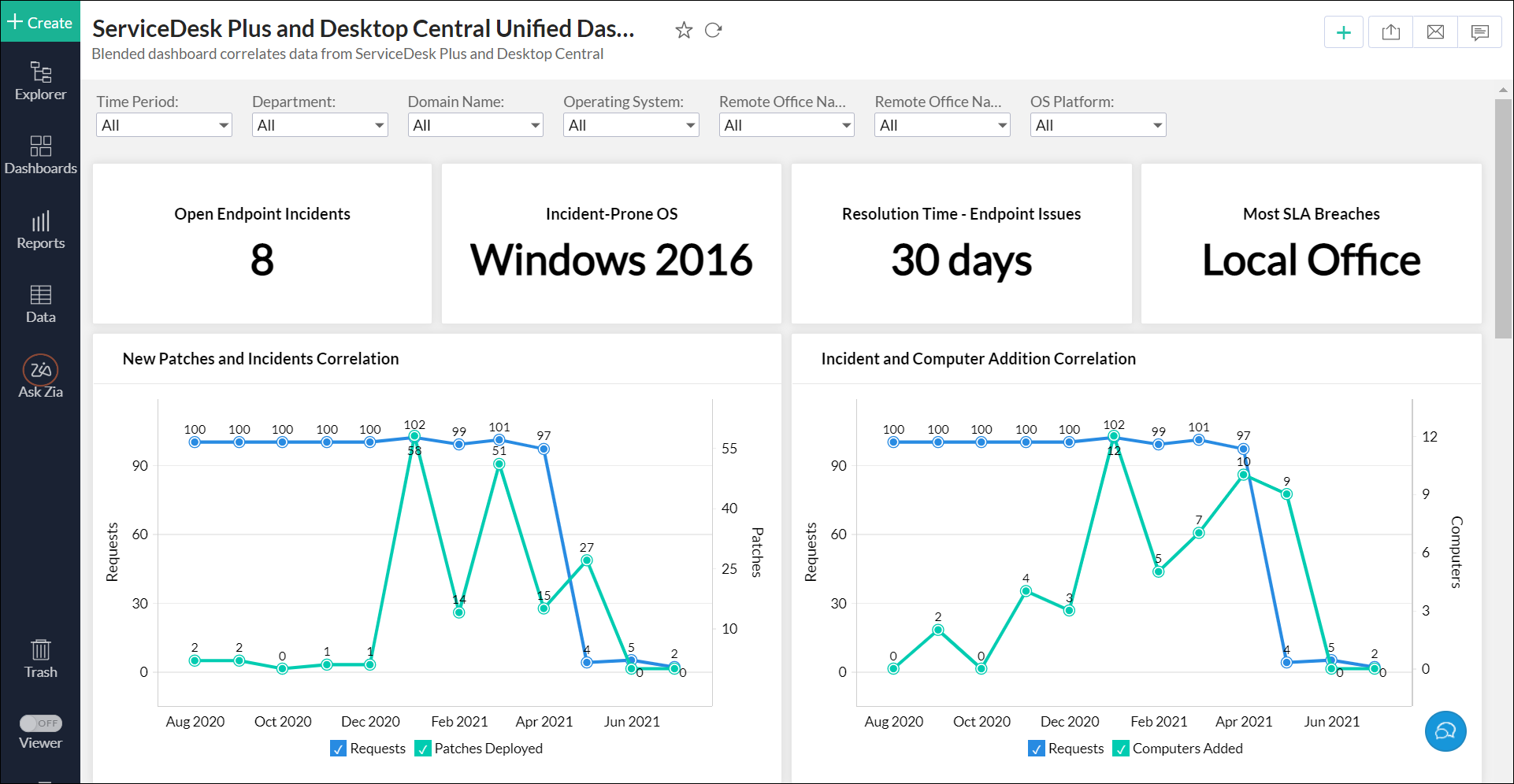 The following is an out-of-the-box blended dashboard built on data from ServiceDesk Plus and Endpoint Central.