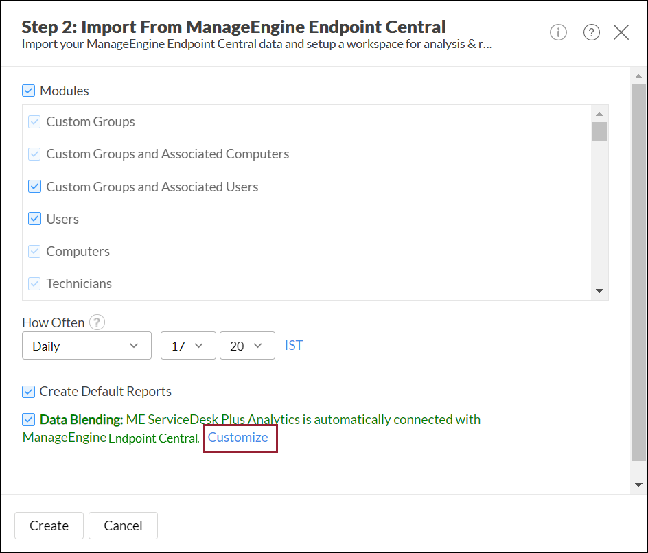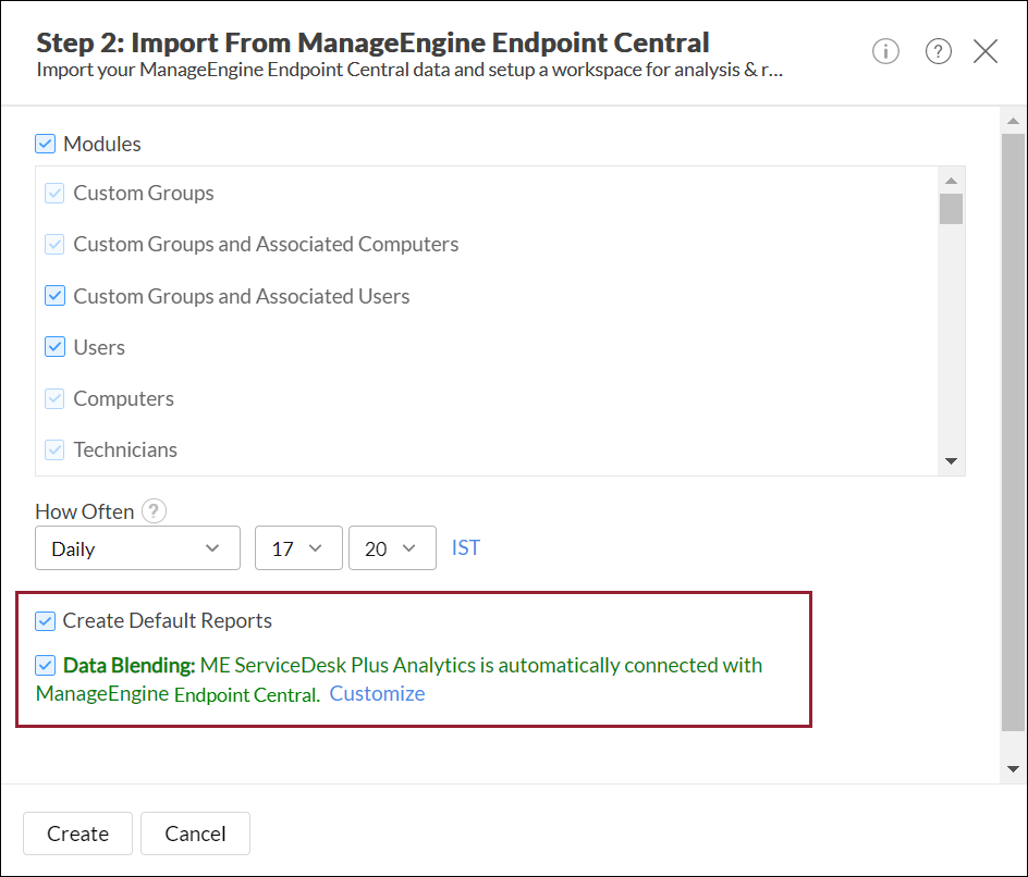 • In the page that appears, select the required Endpoint Central modules. To generate Analytics Plus' out-of-the-box reports and dashboards for Endpoint Central, select the Create default reports checkbox. To generate blended reports that combine data from ServiceDesk Plus and Endpoint Central, select the Data blending checkbox. Click Create to set up the integration.