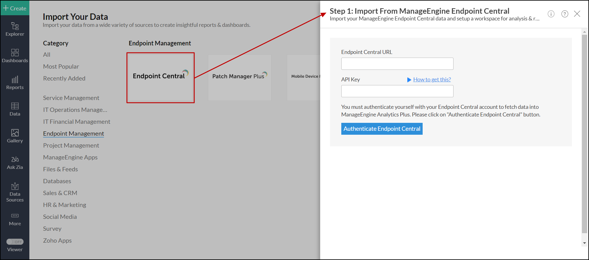 • Select the Endpoint Central tile, enter the Endpoint Central application URL and the API key and click Authenticate Endpoint Central. To learn more about generating the API key, refer this documentation.