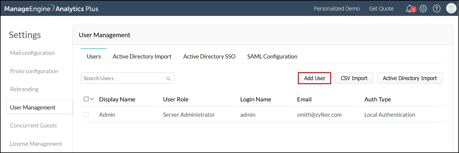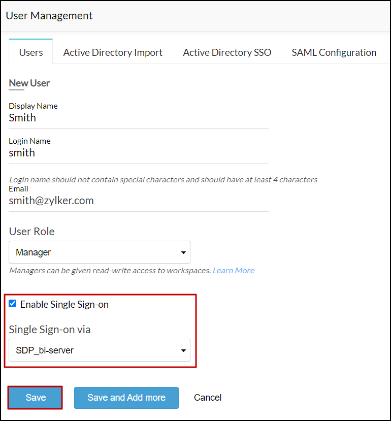 Analytics Plus allows you to associate SSO configuration with both the new and existing users. Click Add User to add a new user or click the edit icon that appears on mouse over the corresponding user.