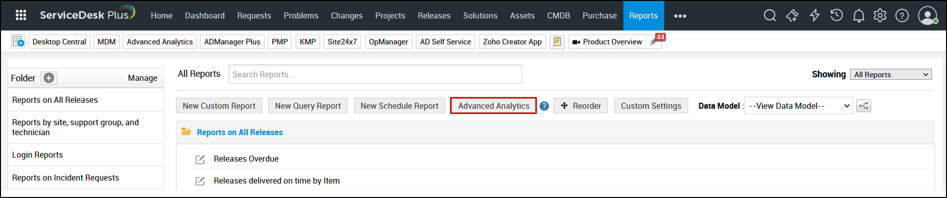 The configured ServiceDesk Plus user can now access the Analytics Plus workspace from within the ServiceDesk Plus interface by clicking the Advanced Analytics button.