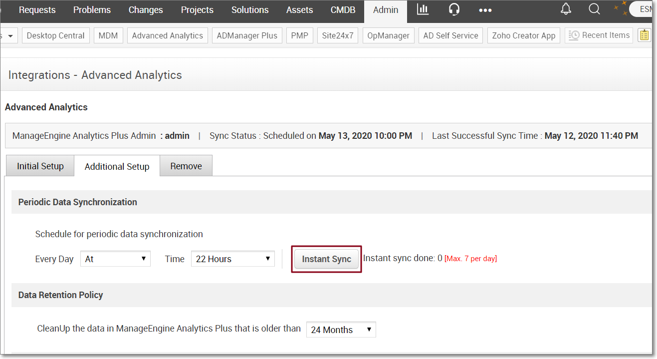 Yes. To do this, open your ServiceDesk Plus application. Navigate to Admin > Advanced Analytics, and click the Additional Setup tab. The Instant Sync button allows you to trigger a data synchronization manually. This action can be done a maximum of seven times in a day.