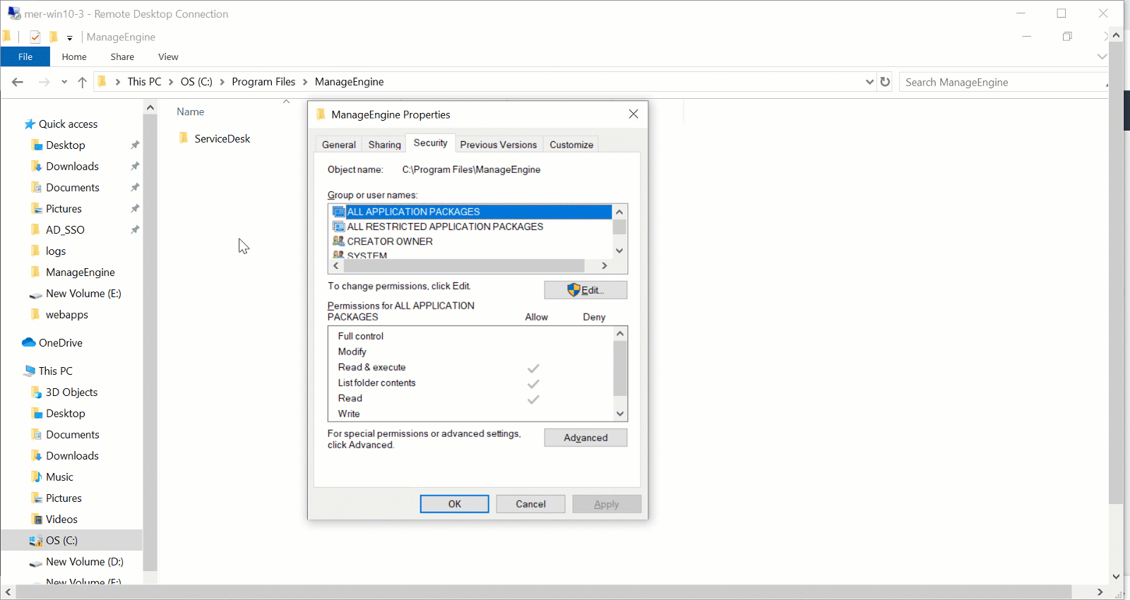 • Navigate to where ServiceDesk Plus is installed in your server. Right click the folder, select the Properties option and navigate to the Security tab.