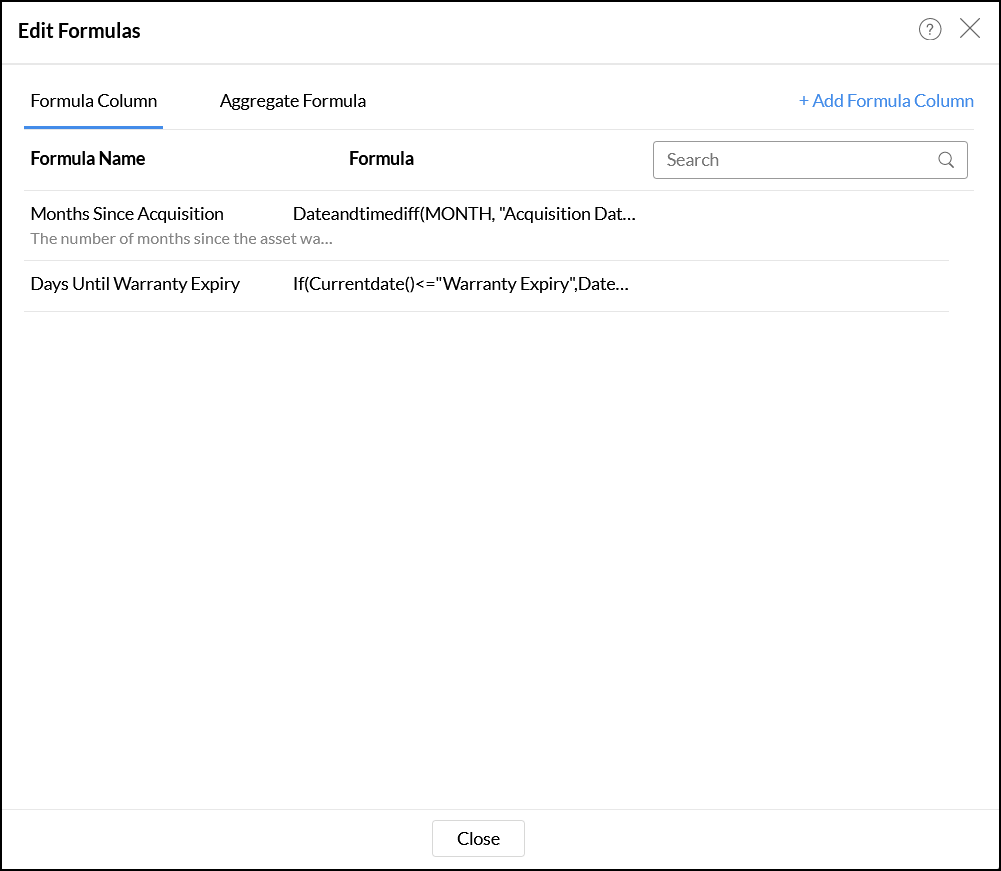 Formulas are calculations that can be defined using the powerful formula engine in Analytics Plus, to create required reports. Refer this documentation to know more. There are also several default formulas created based on the ServiceDesk Plus MSP modules. To view the default formulas, open the required table, click Add and select the Edit Formulas option.