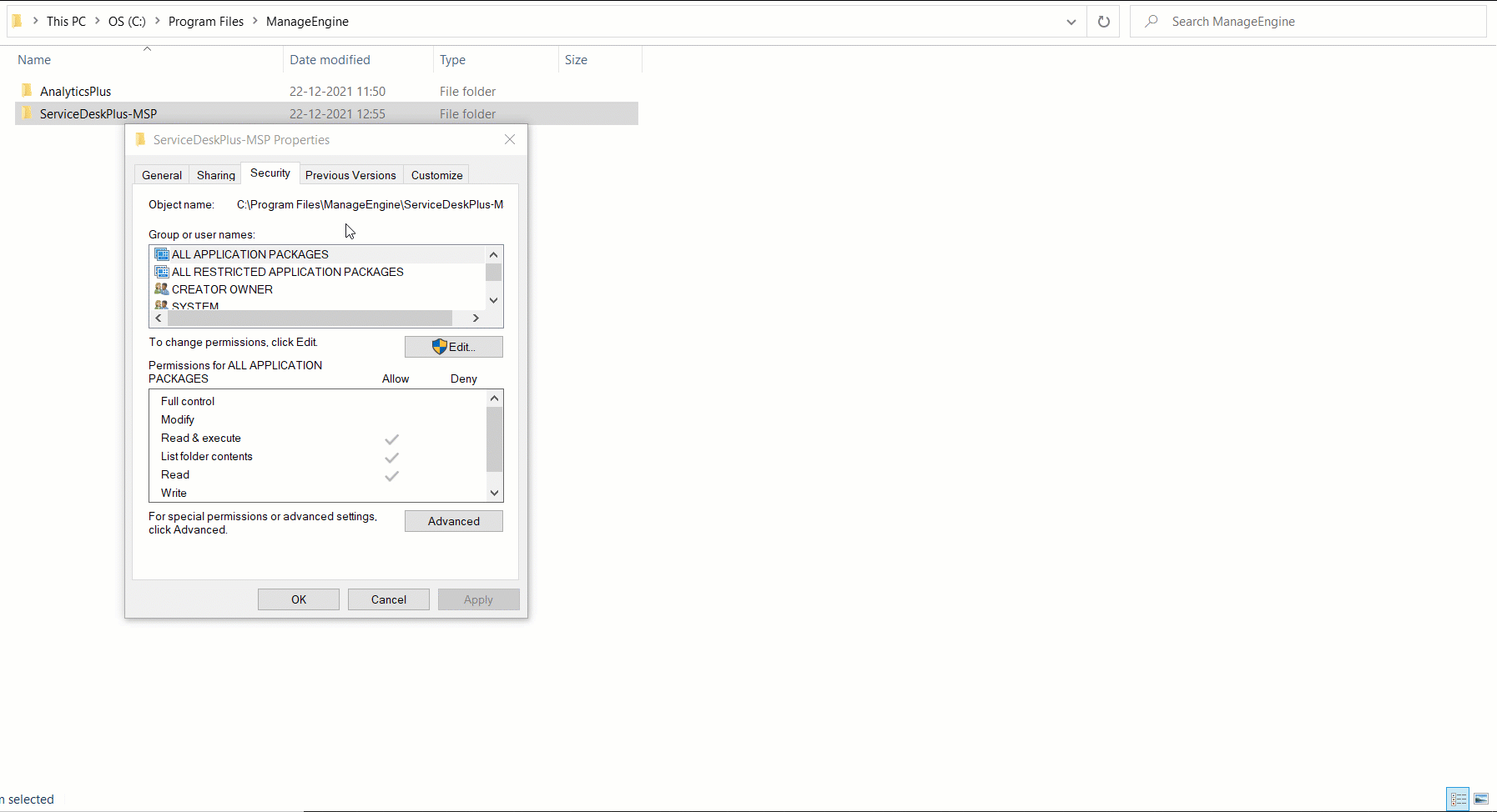 • Right-click the ServiceDeskPlus-MSP folder and select Properties. In the dialog that appears, navigate to the Security tab.