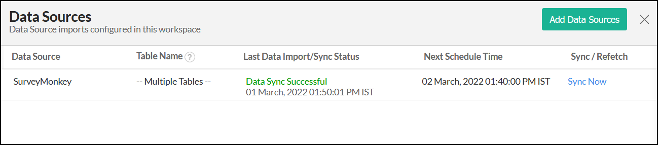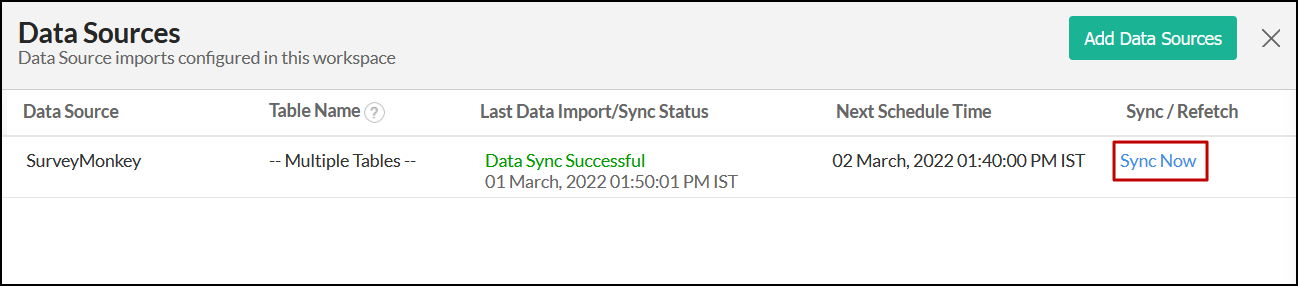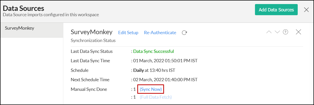 You can also access the SurveyMonkey data source page, and click Sync Now.
