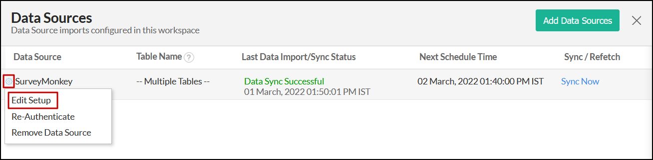 1. Click the Settings icon that appears on mouse over on the SurveyMonkey data source and click the Edit Setup option.