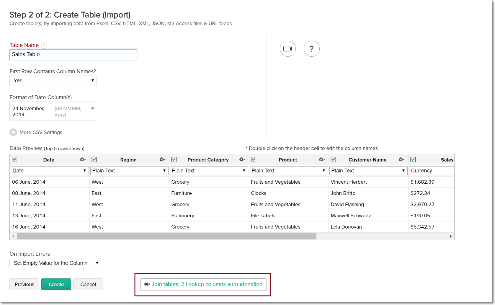 • Analytics Plus matches the new data being imported with the existing tables, identifies the columns with the same names and data types, and suggests them for joining.  You can click the Join Tables: Lookup column auto-identified link at the bottom (In Step 2 of 2: Create Table) to create the lookup.