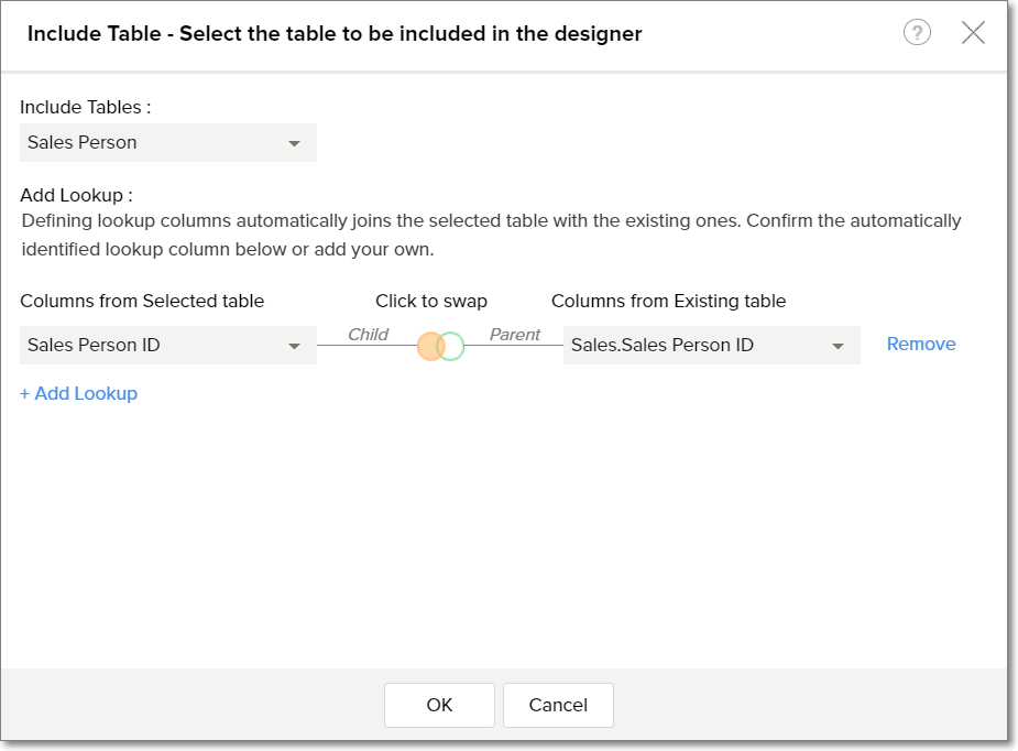 • By default, the column from the existing table is defined as parent, and the column from the new table is defined as child. You can swap the relationship by clicking the circles connecting the tables. You can also remove the lookup suggestion by clicking the Remove button adjacent to the suggestion.