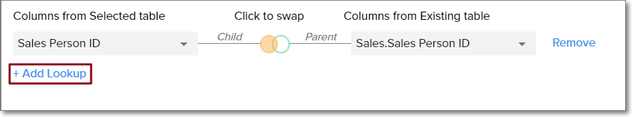 • By default, the column from the existing table is defined as parent, and the column from the new table is defined as child. This relationship can be swapped and the lookup suggestion can also be deleted, as seen in the Auto-Join from the Import Wizard section. You can also define multiple lookups by clicking the +Add Lookup link.