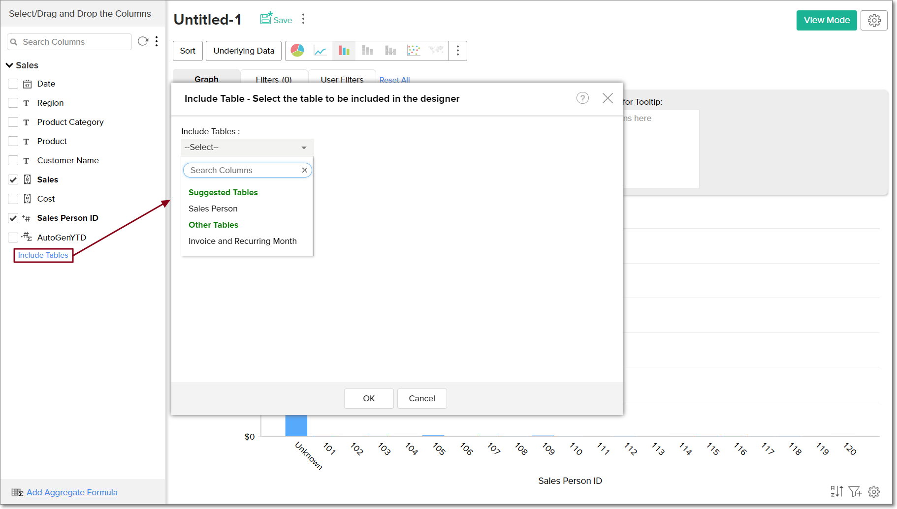 Analytics Plus allows you to join tables from the report editor when you need to include data from another table. Let's say you want to create a report on Sales by Sales Person. Your Sales table data might just have the Sales Person ID. You can add the Sales Person Name from Sales Person table. The following section explains how this works.