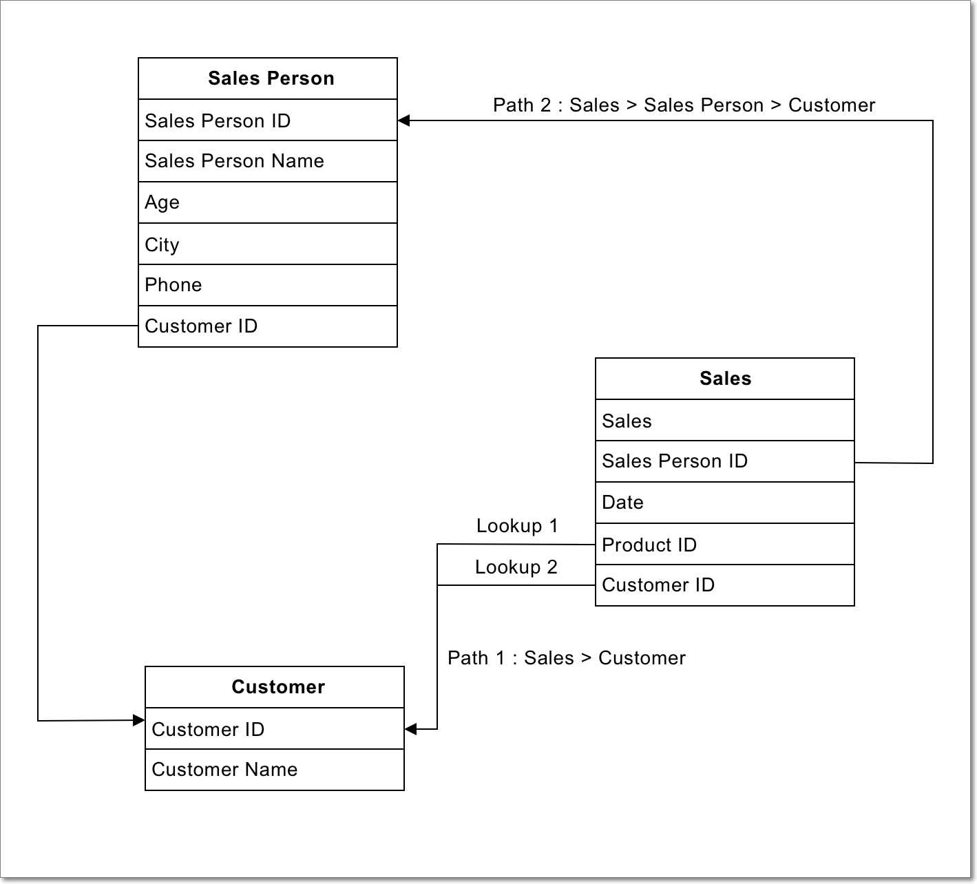 Let's take an example of Sales model. Here the Sales and the Customer tables are directly joined using two lookup columns i.e., Product ID and Customer ID.  The Sales table also has a lookup to the Sales Person table using the Sales Person ID. The Sales Person and the Customer tables are joined using Customer ID. This creates an indirect connection between the Sales and the Customer tables through the Sales Person table.