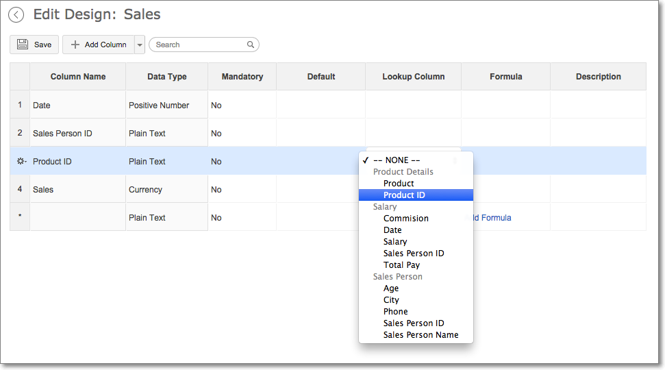 • In the dialog box that appears, click on the the cell under Data Type column for the Sales Person ID and choose the data type as Lookup Up Column from the drown-down list.