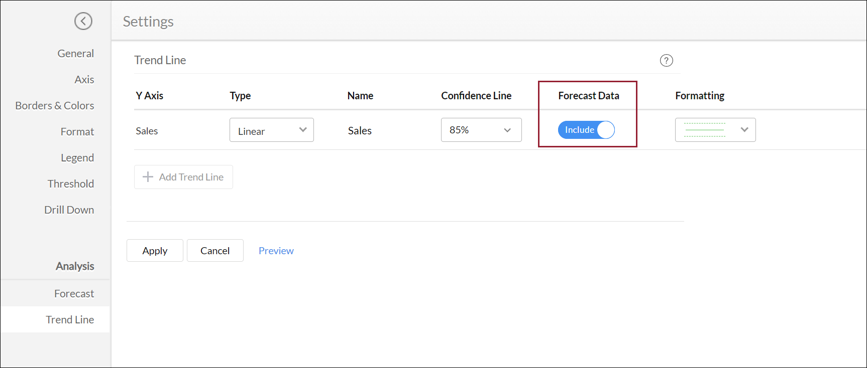 • Forecast Data: Use this option to include or exclude forecasted values from the trend line calculation.