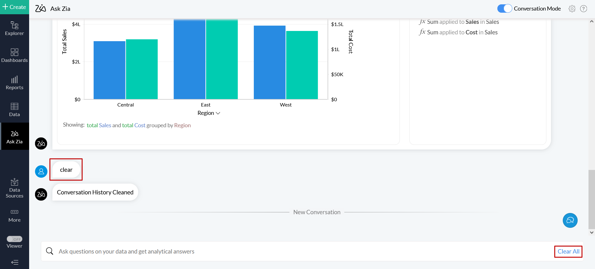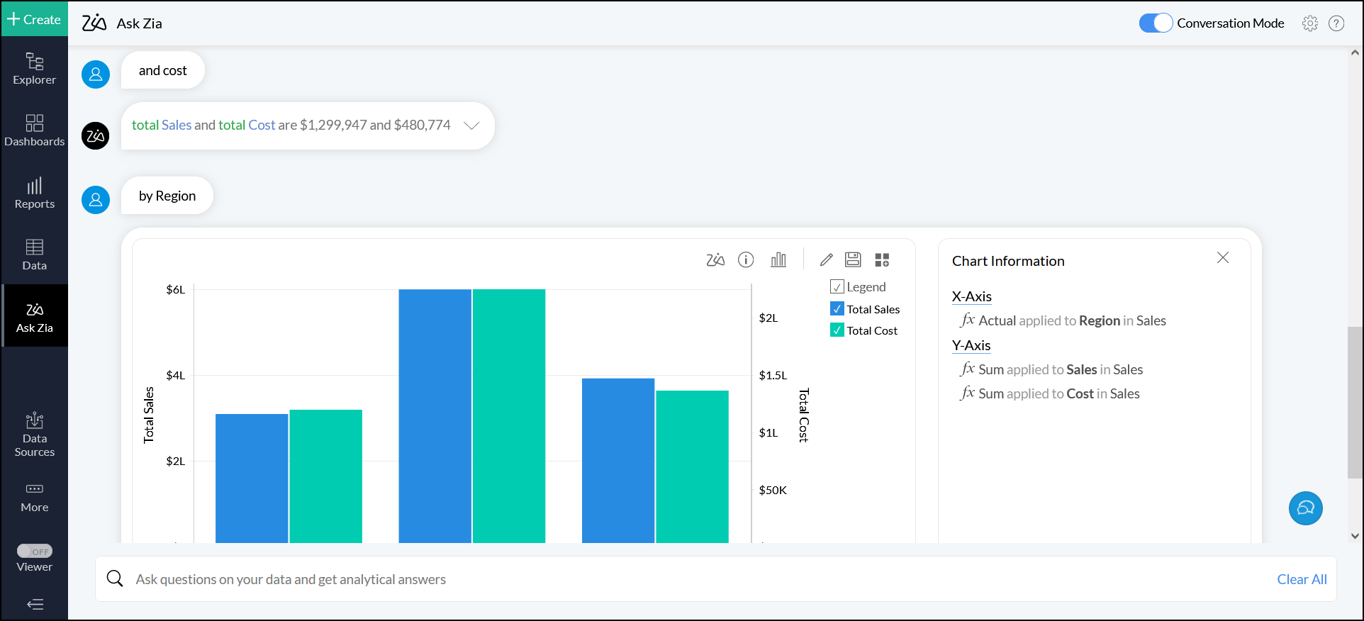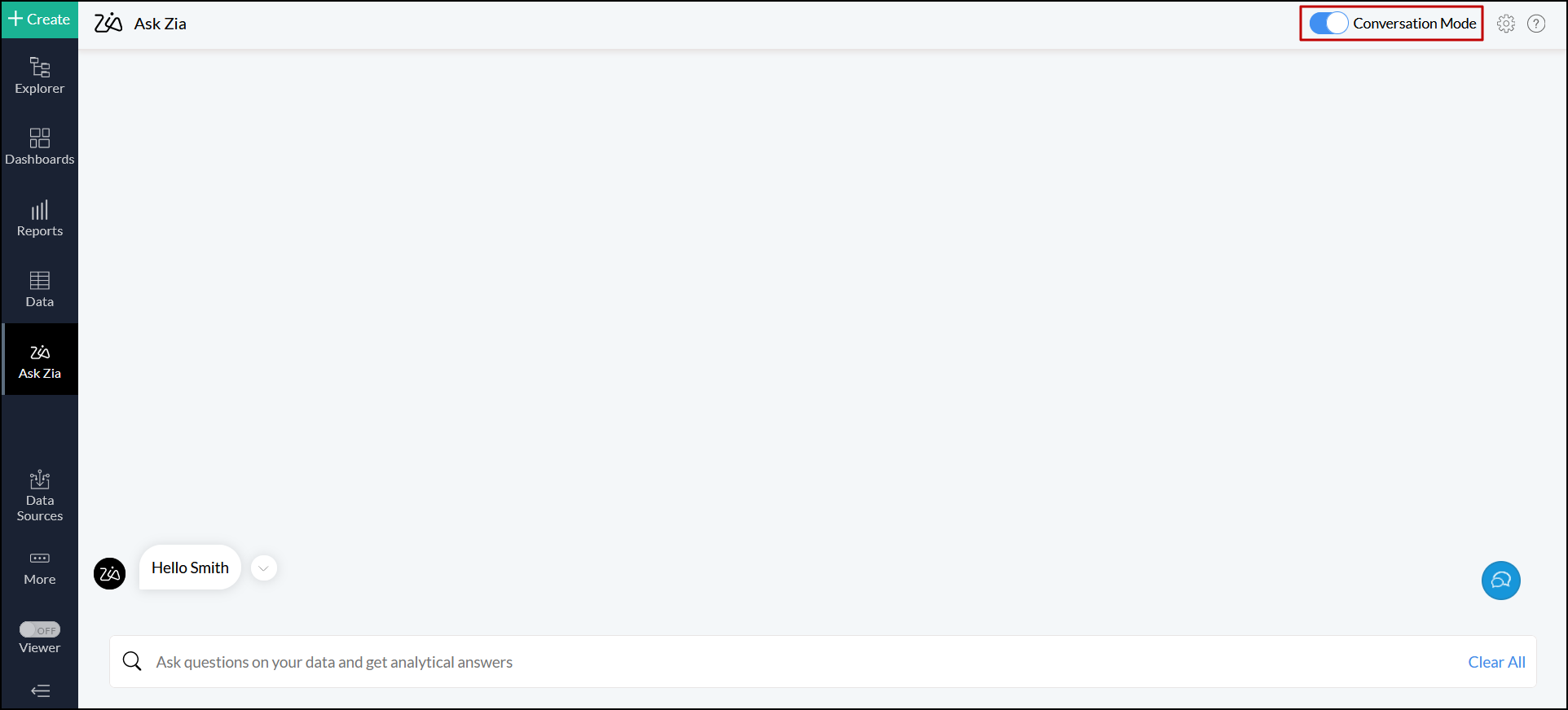 To converse with Ask Zia, enable the Conversation Mode toggle button at the top right and start chatting with Zia.