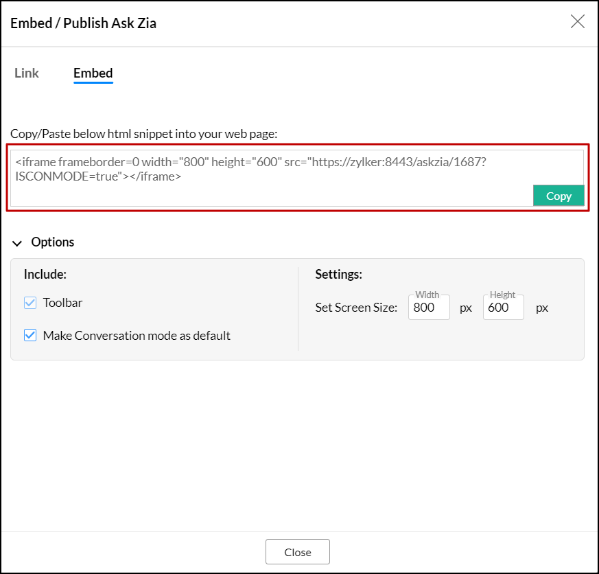 - Set Screen Size: This options lets you set the required screen size to embed the Ask Zia in your environment.