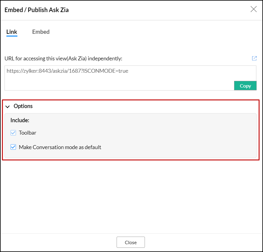 Analytics Plus paves a way to let your users securely access Ask Zia. You can either create a permalink or generate an embedded link and share it with the users to access Ask Zia and generate their own reports.